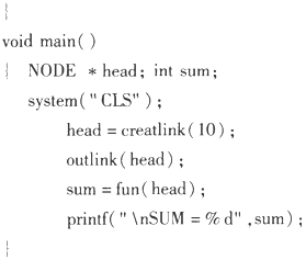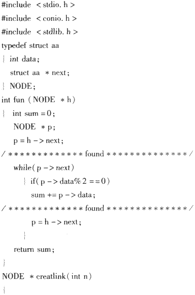 下列给定程序是建立一个带头节点的单向链表,并用随机函数为各节点赋值。函数fun的功能是将单向链表节点(不包括头节点)数据域为偶数的值累加起来,并且作为函数值返回。