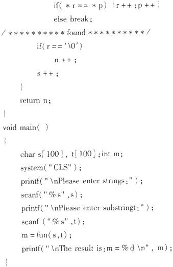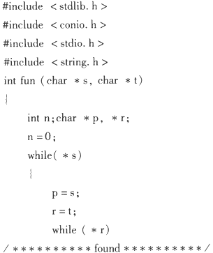 下列给定程序中,函数fun的功能是:从s所指字符串中,找出t所指字符串的个数作为函数值返回。例如,当s所指字符串中的内容为“abcdabfab”,t所指字符串的内容为“ab”,则函数返回整数3。