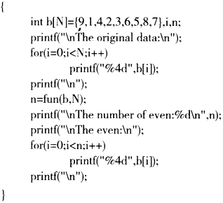 例如,若a所指数组中的数据最初排列为:9、1、4、2、3、6、5、8、7,删除奇数后a所指数组中的数据为:4、2、6、8,返回值为4。