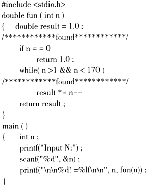 给定程序MODI1.C中函数fun的功能是计算“n!”。