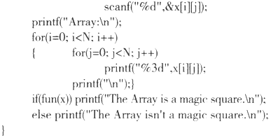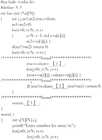 给定程序中,函数fun的功能是:判定形参a所指的N×N(规定N为奇数)的矩阵是否是“幻方”,若是,则函数返回值为1;若不是,则函数返回值为0。“幻方”的判定条件是:矩阵每行、每列、主对角线及反对角线上元素之和都相等。