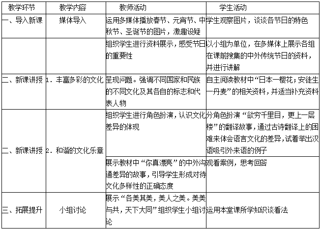 材料:某教师在讲授《丰富多彩的文化》这一教学内容时,一方面借助多媒体,播放西方各国的民族节日及庆祝方式。另一方面,结合当地作为少数民族聚居区有大量文化资源的实际情况。请学生以小导游的身份,向全班同学介绍本民族或者自己熟知的我国其他民族的节日来历与庆祝方式。通过让学生直观地感受不同的风俗习惯与形式来认识不同国家的不同文化。该教师将整堂课设计为一次文化之旅,在轻松.快乐的氛围中使学生认识到了文化具有的多样性,并能正确认识各民族文化,完成了本节课的教学目标。
