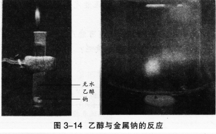 在盛有少量无水乙醇的试管中,加入一小块新切的.用滤纸擦干表面煤油的金属钠,在试管口迅速塞上配有医用注射针头的单孔塞,用小试管倒扣在针头之上,收集并验纯气体;然后点燃,并把一干燥的小烧杯罩在火焰上(如图3—14),片刻在烧杯壁上出现液滴后,迅速倒转烧杯,向烧杯中加入少量澄清的石灰水,观察实验现象,比较前面做过的水与钠反应的实验,并完成表5。
