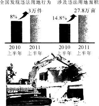 4.2011年7月12日,国土资源部公布了今年第二季度和上半年的土地、矿产违法违规情况。通报显示,上半年全国发现违法用地行为3万件,共有近700人被移交司法和纪检监察机关,西部地区违法违规用地呈快速上升趋势,个别地方存在违法违规建设高尔夫球场问题。以下是反映2011年上半年我国违法用地情况的图片: